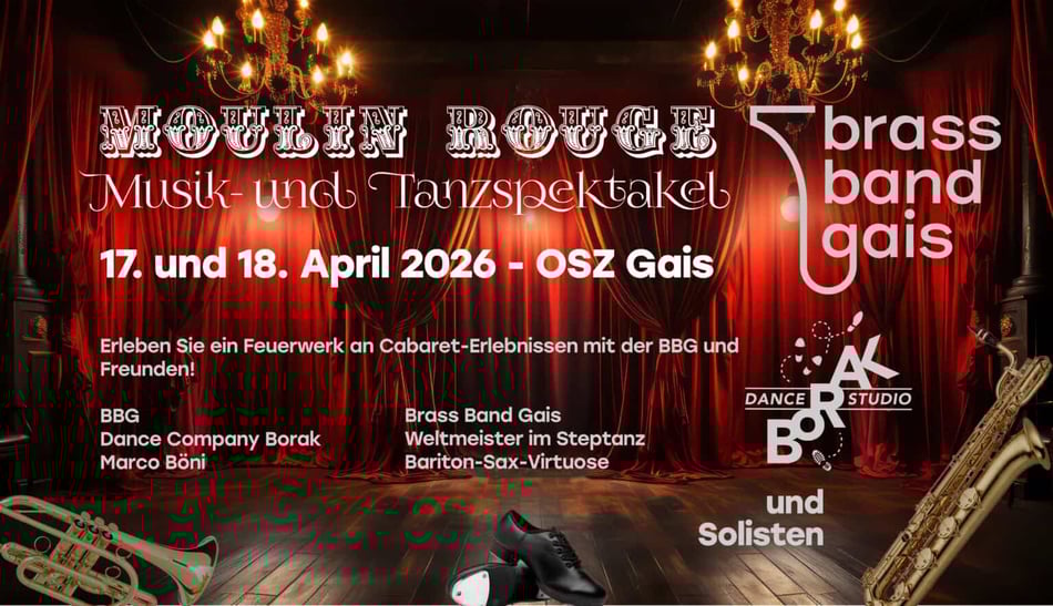 Die Brass Band Gais lädt am 17. und 18. April 2026 ein zu einem spektakulären Jahres-Hauptevent ganz im Stil des berühmten Moulin Rouge. Mit einer mitreissenden Steptanzgruppe, farbenprächtiger Showatmosphäre und einem hochkarätigen Gastsolisten verspricht der Abend ein unvergessliches Erlebnis voller Musik, Rhythmus und Emotionen zu werden.